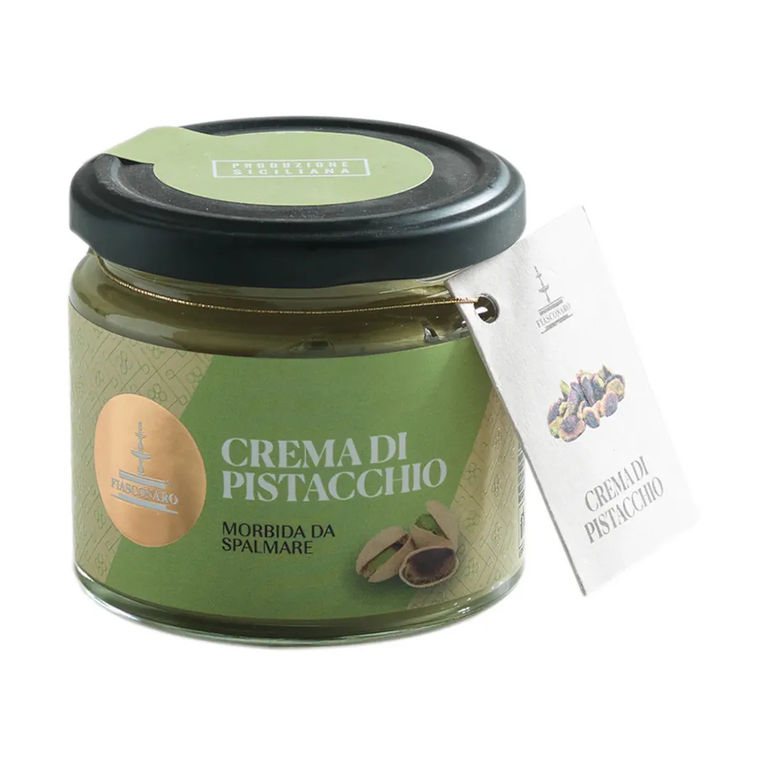 Crema di pistacchio da spalmare, dalla ricetta unica e golosa, frutto di un accurato processo di lavorazione di ingredienti scelti privilegiando le produzioni tipiche della Sicilia.