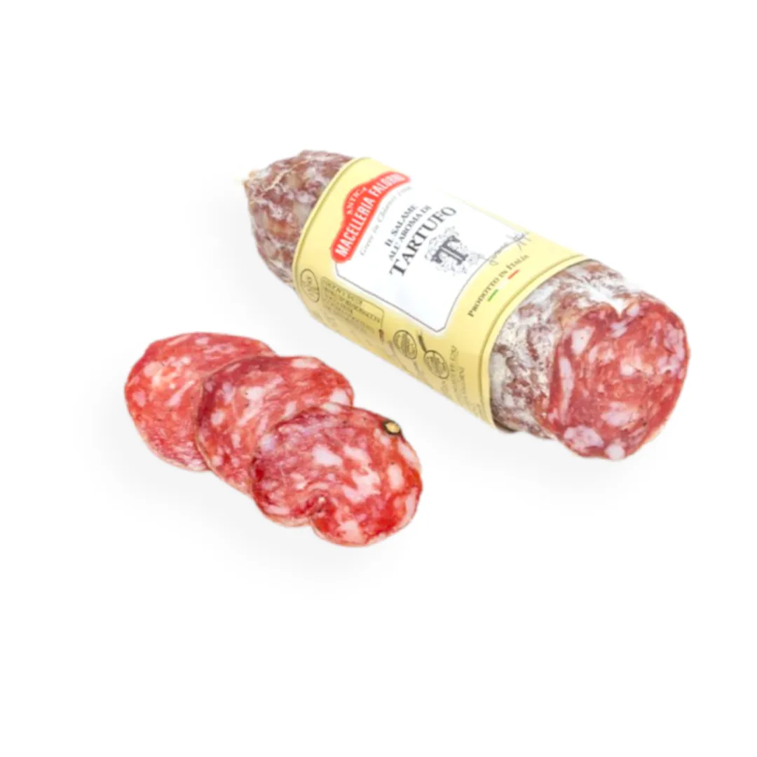 Proveniente da suini 100% italiani, questo salame unisce al gusto speziato e deciso del Salame Toscano il raffinato sapore del tartufo nero locale. Affettato sottile e al momento, sprigiona tutta la sua ricchezza aromatica ed esprime il suo sapore ricercato. Metodo di produzione Salame a macinatura media, viene prodotto con metodi artigianali, insaccato in budello naturale e stagionato naturalmente per 7-8 settimane.