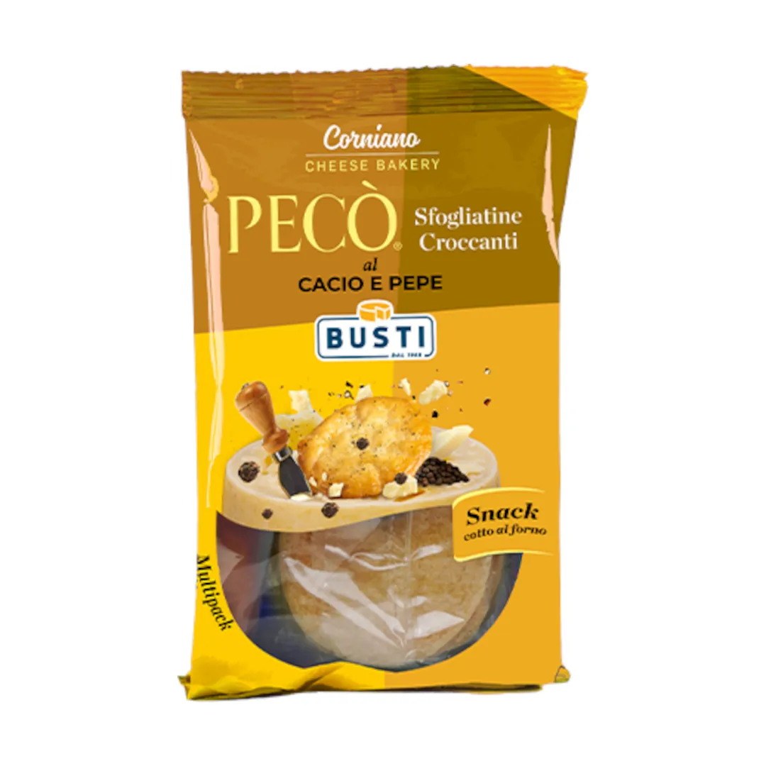 Una croccante sfogliatina ottenuta dalla sapiente combinazione di ingredienti scelti uniti al nostro Pecorino Toscano DOP e preparato cacio e pepe, lavorata artigianalmente e cotta al forno.