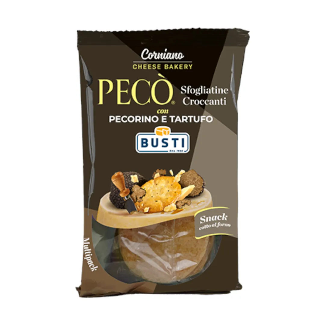 Una croccante sfogliatina ottenuta dalla sapiente combinazione di ingredienti scelti uniti al nostro Pecorino e tartufo, lavorata artigianalmente e cotta al forno.